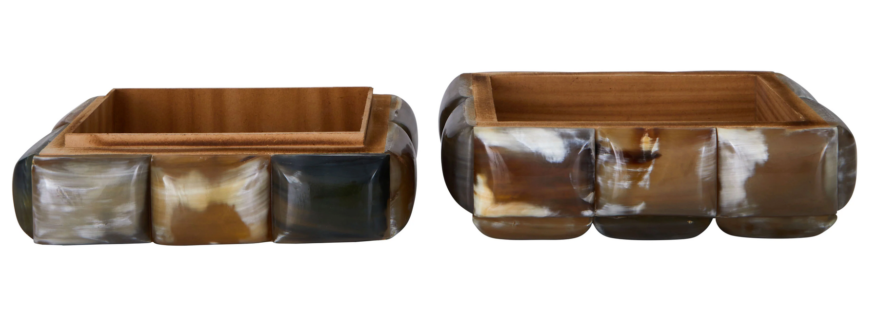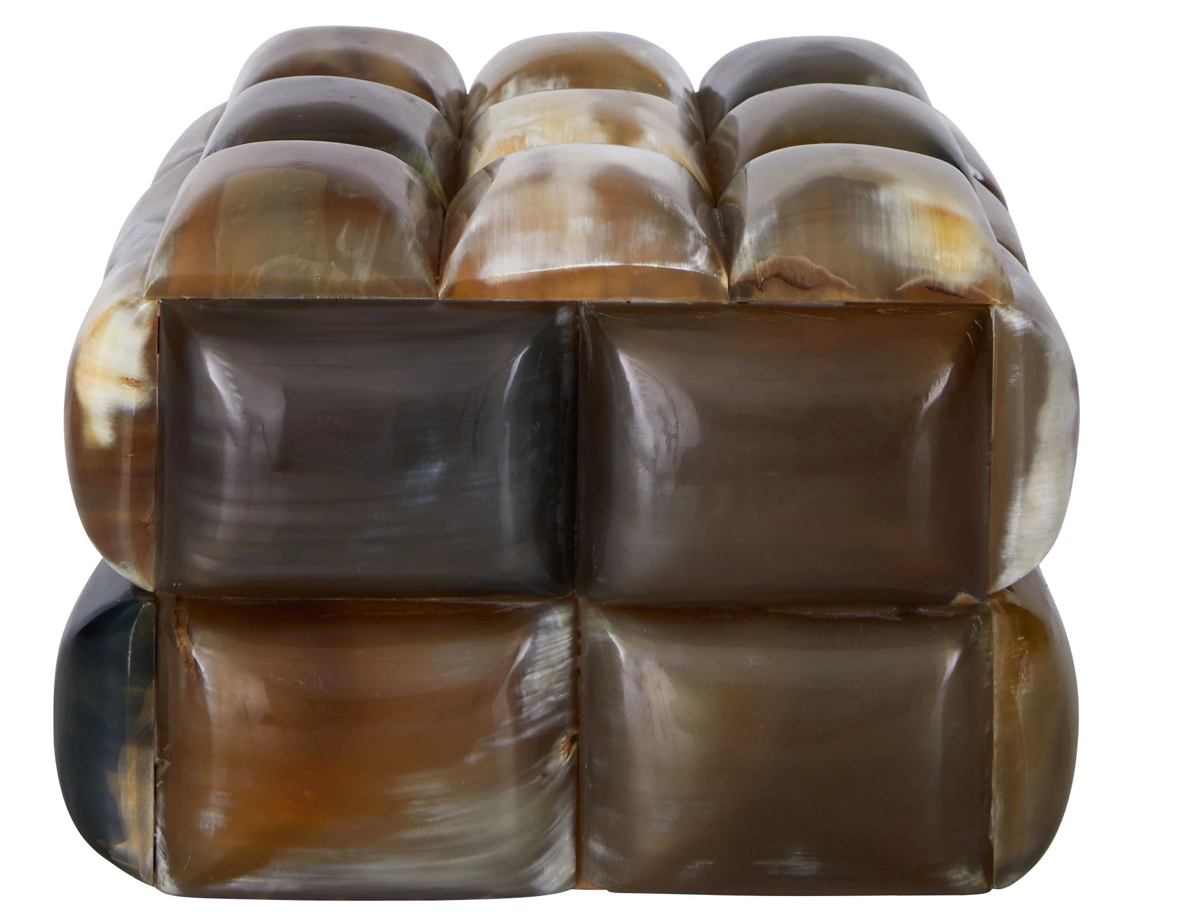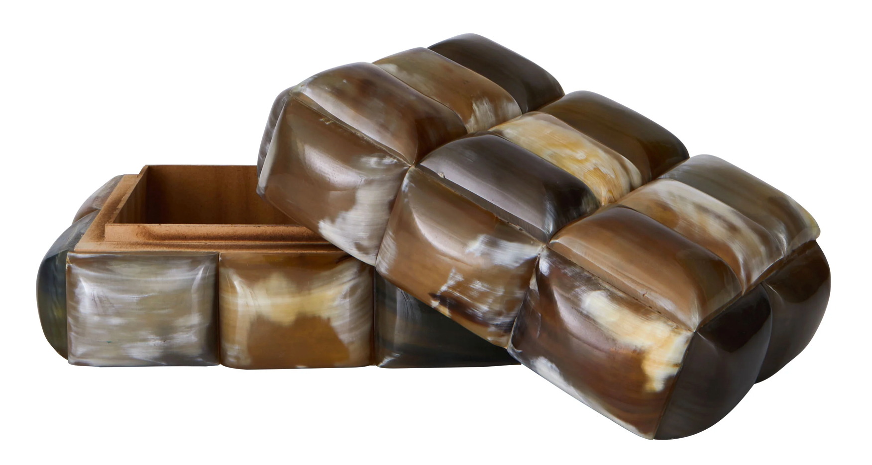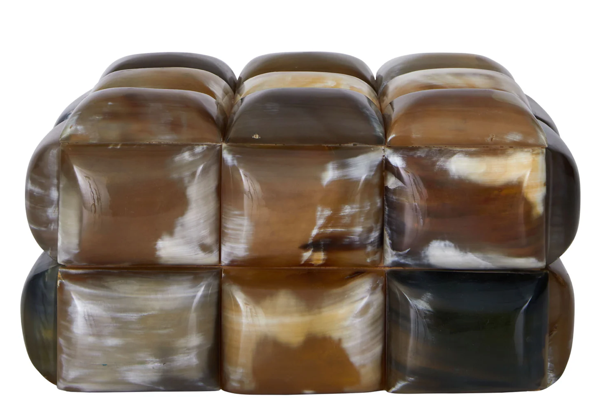 Add a little something chic to your home with our handsome Bubble Box. Handmade by artisans, this lidded vessel is covered in dimensional tiles crafted from unique pieces of naturally shed water buffalo horn in beautiful shades of brown, cream and white. A useful addition to any room of the house, our Bubble Box would be great sitting atop the coffee table for a spot to stash remotes or on the dresser for storing jewelry and other everyday accessories.