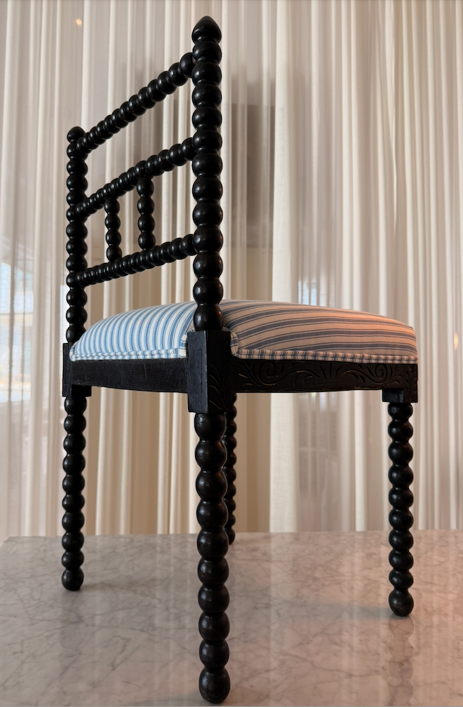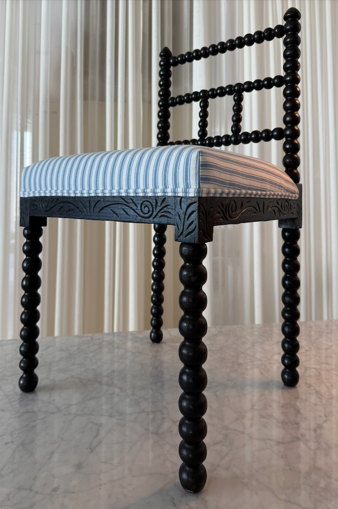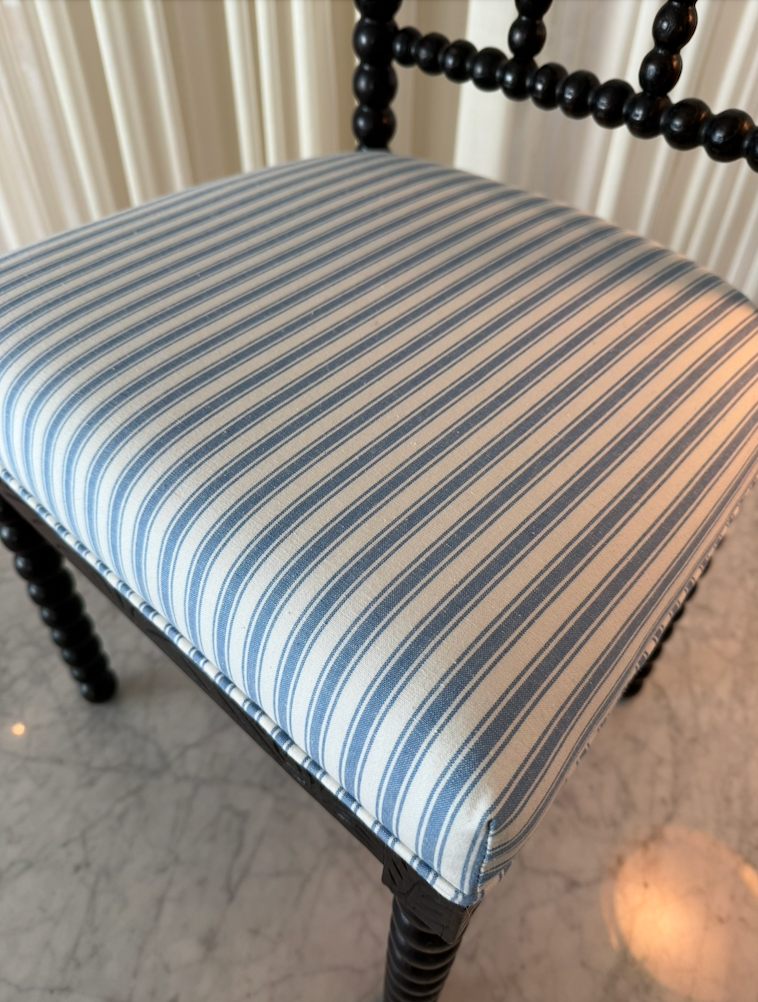 Vintage dark wood bobbin chair, freshly upholstered in a blue and white ticking stripe. Also known as a "spool chair" characterized by its lathe-turned legs, stretchers and spindles that resemble rows of spools or bobbins used in textile manufacturing.